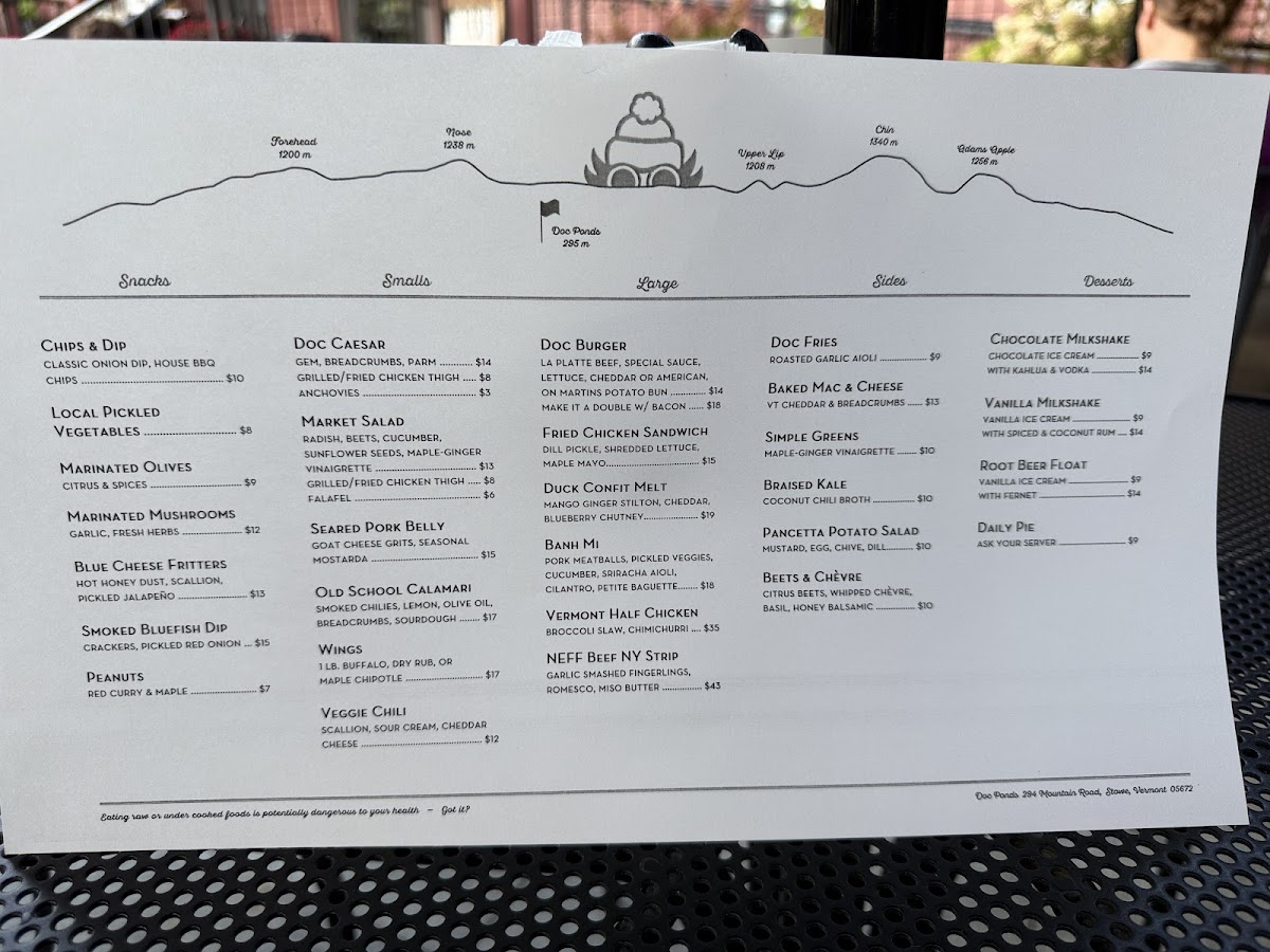 - Smalls: A variety of light starters and sharing plates including items such as bluefish dip with crackers, Caesar-style chopped romaine salad, cheese fritters with hot honey, market salad with quinoa and maple ginger dressing, and pan-seared calamari.