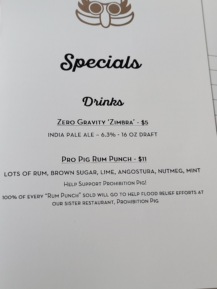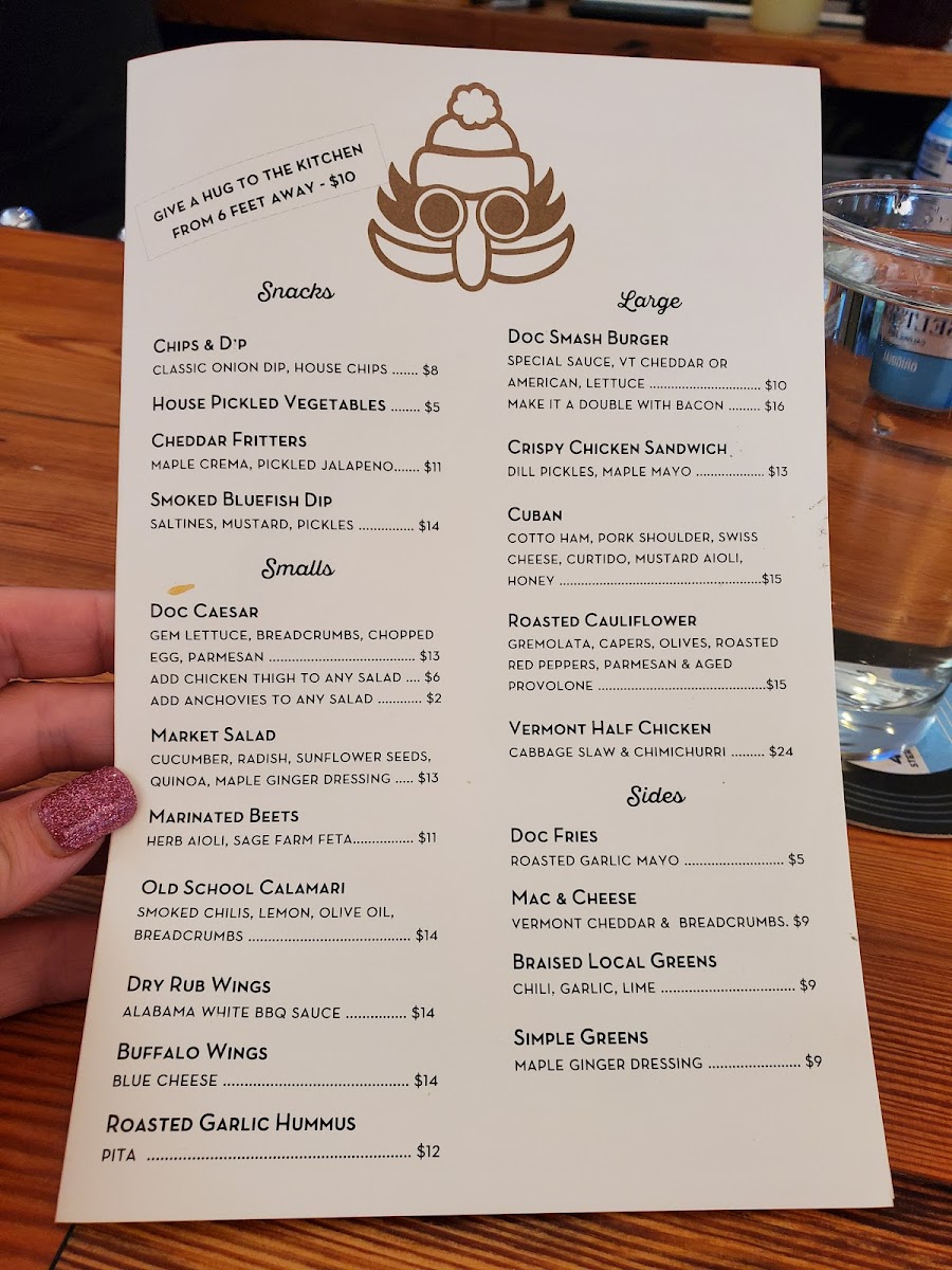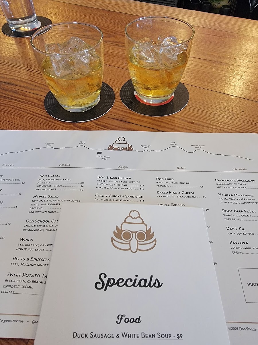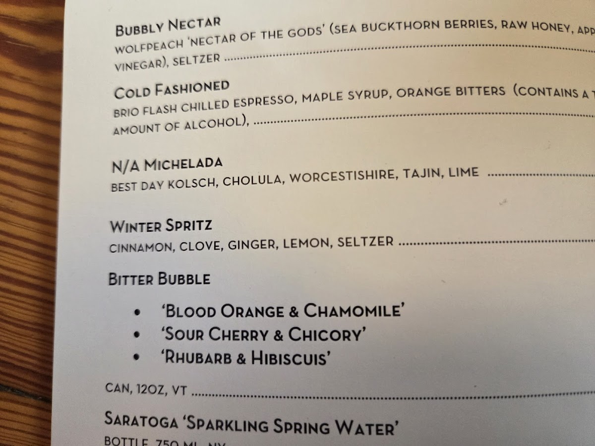 - Options include a selection of specialty Bitter Bubble flavored sodas, cold brew coffee, classic soft drinks like ginger ale, Coke, Diet Coke, Sprite, and unique offerings such as a cold fashioned and Doc’s Spritz mocktail.